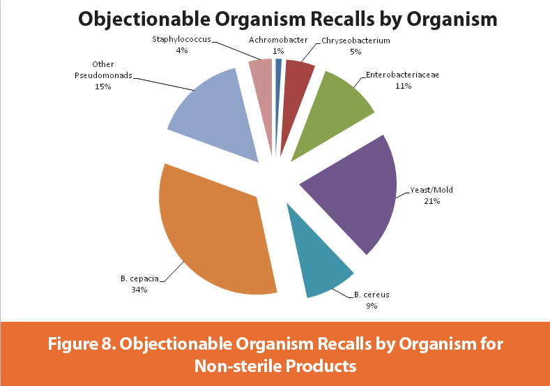 FDA召回的非無菌產(chǎn)品中,洋蔥伯克霍爾德菌(B.cepacia)污染是涉及召回次數(shù)最多的微生物污染召回事件,在2004-2011FDA召回事件中的不可接受微生物,占三分之一的污染微生物為洋蔥伯克霍爾德菌(Burkholderia cepacia)。