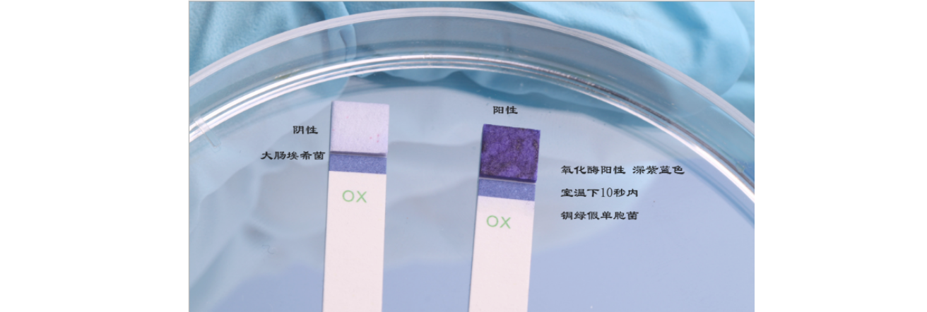 原理:銅綠假單胞菌含有細胞色素氧化酶,該酶是細胞色素呼吸酶系統(tǒng)的最終呼吸酶。具有氧化酶的細菌,首先使細胞色素C氧化,再由氧化型細胞色素C使對苯二胺氧化,生成有色(如粉紅色或紫紅色)的醌類化合物。
