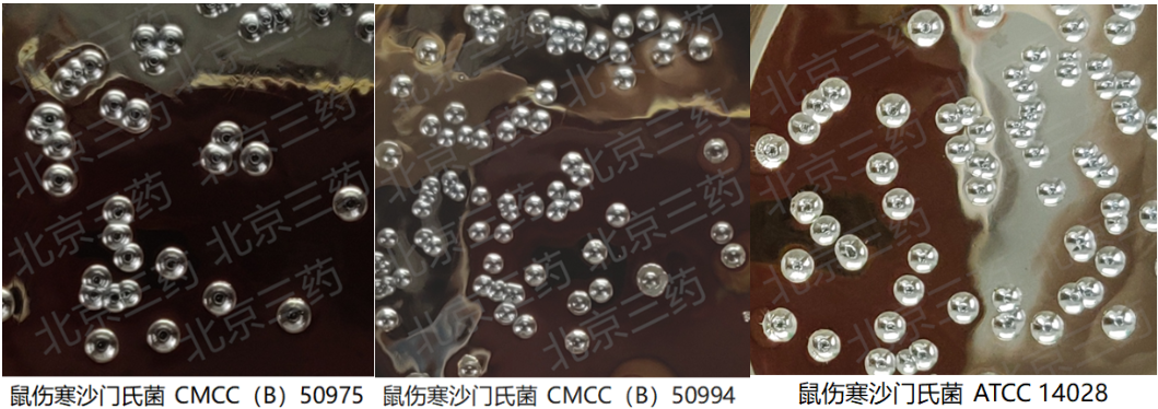 亞硫酸鉍瓊脂(BS)(產(chǎn)品號:12C04)平板上生長的多株沙門氏菌的菌落形態(tài)典型,可產(chǎn)生明顯的金屬光澤,易與其他雜菌區(qū)分。在進(jìn)行沙門氏菌檢測的過程中,同時需要與其他選擇性分離平板(如XLD、HE或沙門氏菌顯色培養(yǎng)基)上分離的典型和可疑菌落純化后進(jìn)行后續(xù)的生化與血清學(xué)鑒定,綜合分析判斷是否為沙門氏菌。