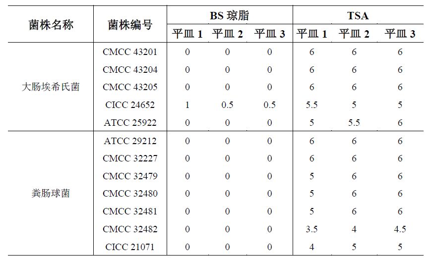 本培養(yǎng)基要求抑制大腸埃希氏菌,避免對沙門氏菌的分離產(chǎn)生干擾;同時抑制革蘭氏陽性菌-糞腸球菌,故自實(shí)驗(yàn)室中選取5株大腸埃希氏菌和7株糞腸球菌進(jìn)行驗(yàn)證。