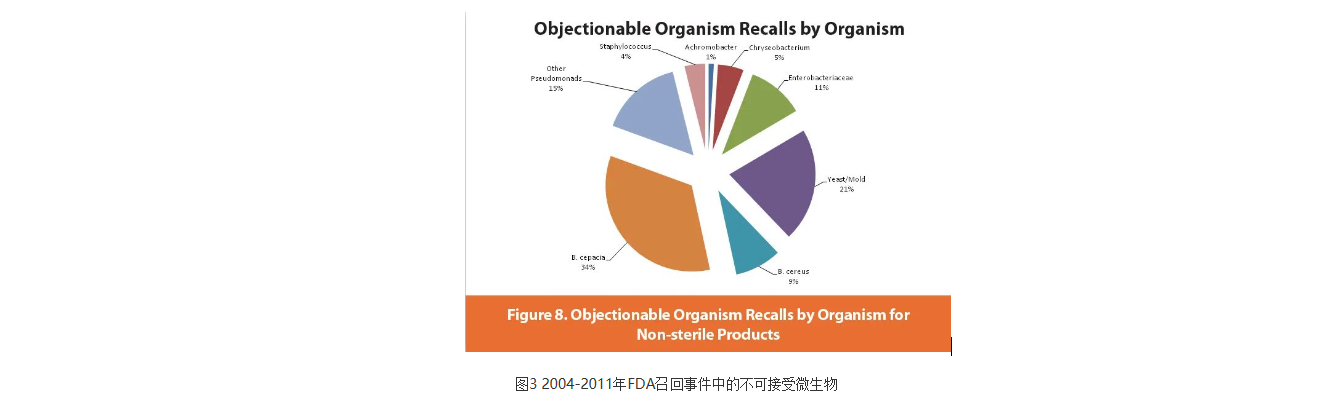 在FDA召回的非無菌產(chǎn)品中,洋蔥伯克霍爾德菌(B.cepacia)污染是涉及召回次數(shù)最多的微生物污染召回事件,在2004-2011年FDA召回事件中的不可接受微生物,占三分之一的污染微生物為洋蔥伯克霍爾德菌(Burkholderia cepacia)。